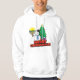 Um bonzinho de neve segurando um menorah com uma árvore de Natal - desejando-lhe uma Feliz de Chrismukkah em um capuz branco.