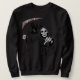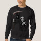 A camisola deste homem é mostrada a preto com um design de impressão de ceifa assustador no Halloween.