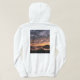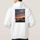 Um capuz com uma fotografia de uma praia por pôr do sol.