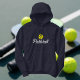 Um capuz desportivo de manga comprida para homens. Vestuário de tênis personalizado com logotipo de bola amarela e texto de script. Legal ideia de presente de Festa de aniversário desportiva para fã, jogador, treinador, pai, adolescente, marido, pai, tio, avô, namorado etc. Mude o logotipo da bola para qualquer cor. Excelente também para outras atividades. Personalize com sua própria citação engraçada ou nome do grupo. Disponível em azul-marinho e outras cores. Camiseta atlética para ele. Ideias de presentes de Natal para caras.