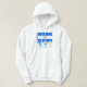 Jogo de três jogadores de futebol na frente da bandeira nicaraguense. O nome de país Nicarágua está no lado