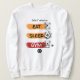 O design apresenta um tema inspirado em jogos de vídeo e consiste na frase "Selecionar missão" no topo, com três opções listadas abaixo como se fossem níveis ou opções num jogo de vídeo. As opções são: "EAT", que é ilustrado com uma figura Comendo, significando a ação de comer. "SONO", que tem uma figura em uma postura relaxada ou dormindo, simbolizando o repouso ou o sono. "GYMM" (normalmente soletrado em "GYM"), mostrada com um número de pesos de elevação, indicativo de exercícios ou de trabalho numa academia. Cada "missão" ou opção é colocada sobre um fundo de cor diferente (cor laranja e vermelha, respectivamente), com uma aparência áspera e bruxaria, e os números são representados como caracteres humorísticos e simplificados, possivelmente sugerindo 'koalas', que se envolvem na atividade correspondente. Essa design toca na rotina diária de um indivíduo dedicado à malhação e ao bem-estar, enfatizando um ciclo de vida que gira em torno de comer, dormir e trabalhar fora. É provavelmente destinado a um público interessado em malhações e videos games.