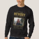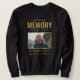 Camisola memorial em preto e ouro com uma foto tesourada da pessoa que faleceu, um elegante borda de efeito gravado em ouro, seu nome, datas de nascimento/morte, uma mensagem personalizada de celebração da vida, e o ditado "para sempre em nossos corações".