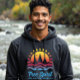 Esta camiseta é excelente para pessoas que são espíritos livres e adoram viagem ou explorar lugares. O texto azul diz "Espírito Livre" e "para além dos limites" com um script e fonte san serif. Uma cena de abstrato é ilustrada com o sol, ondas, árvores e pássaros com gradiente colorido. Um chapéu correspondente também está disponível.