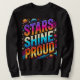 A design de camiseta "Stars Shine Proud" apresenta um céu noturno vibrante cheio de estrelas brilhantes, simbolizando esperança, unidade e brilhantismo. No centro, uma estrela maior irradia luz, representando orgulho e individualidade. As estrelas circundantes formam constelações sutis, criando um sentido de união e de empoderamento. A paleta colorida combina azuis profundos da meia-noite com dourados e silenciosos brilhantes, evocando uma atmosfera celestial. O olhar geral é inspirador e visualmente impressionante, perfeito para aqueles que querem vestir seu orgulho e confiança com estilo.