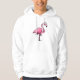 Um flamingo cor-de-rosa engraçado está em um pé na água tropical.