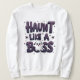 Camisa de suor de nome personalizado do Dia das Bruxas para homens. O design apresenta o texto "Haunt Like a Boss" em tipografia negra e roxa com fantasmas e elementos estrelados no estilo kawaii. Faz o melhor presente personalizado de Halloween para ele (pode ser qualquer um do seu pai para o seu namorado/marido!). Perfeito para fazê-los sentir-se especiais, aumentar a sua confiança e obter um dom único e infeliz! Temos muito mais designs de Halloween tão elegantes em baixo preto e branco para todos, por favor, vejam a nossa coleção/loja! Feliz Dia das Bruxas!