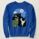 Camisola em Uma ilustração de quatro gatos na vara, com olhos brilhantes, são reunidos sob um céu noturno, com lua de cheio e estrelas. O céu é azul profundo, pontilhado com nuvens fofinhas.