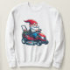Uma ilustração brilhante de um gnomo alegre cavalgando um cortador de grama vermelho, flores de carregando. O design vivo exibe cores vibrantes e uma atmosfera lúdica.