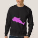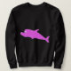 Uns desenhos animados de um golfinho cor-de-rosa brilhante em um fundo preto.