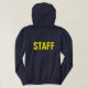 FUNCIONARIOS de capuz para a equipe, funcionários da equipe. Excelente também para pessoal e funcionários da empresa. Design de tipografia a negrito. Cores pretas e brancas ou personalizadas. Faça seu próprio vestuário personalizado para colegas de trabalho, trabalhadores, voluntários, assistentes de caridade, equipe, contínuos, etc. Roupas personalizáveis com fonte moderna. É útil para festas, eventos, feiras, feiras, shows de comércio, casamento, discoteca, clube, bar, pub, trabalhos de segurança, etc. Impresso no dois lados. Logótipo próprio opcional. Disponível em azul marinho, preto e outras cores. Altere a quantidade para obter o preço em massa barato.