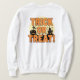 it’s a casual, light-colored shirt ideal for celebrating the Halloween season with a fun, classic “Trick or Treat” graphic on the back.