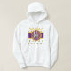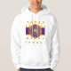 Branco-Hoodie com círculos concêntricos roxo, dourado e branco design acima de um retângulo roxo e dourado com os logotipos Y-NOT-ME "HOLLYWOOD, CALIFÓRNIA CENTER DO UNIVERSO". Esta design é um grito para Hollywood, Califórnia, a capital cinematográfica do mundo.