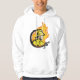 Esta design mostra uma das profissões mais reconhecíveis, um bombeiro. Este bombeiro está colocado contra o fundo de algumas chamas e está segurando uma mangueira de fogo pronta para apagar as chamas. Este bombeiro com uma mangueira de design parece excelente neste significa capuz. Perfeito para si mesmo ou como presente