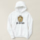 Este capuz tem um design que apresenta a palavra "Judah" em uma impressão com letras negras, em negros, mostrando uma imagem de estilo cartoon da cabeça de um leão com a coroa do rei no centro neste tema de citação baseado na fé. Este capuz é feito a partir de uma mistura de algodão de 10 oz, capas de 100% de algodão embutidas na face de algodão e furos de agulha dupla coçados e banda inferior para durabilidade extra tem uma imagem correspondente no verso.