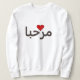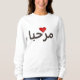 Texto corajoso "Marhaba" no árabe = na boa vinda, olá! - as pias batismais pretas são imprimidas em uma camisola com um coração vermelho.