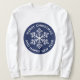 Um floco de neve branco com "Feliz Natal e Feliz ano novo" num círculo azul marinho.