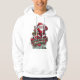 "Papais noeis festivos capuz de Natal. Este design de capuz vibrante apresenta um Papai Noel alegre em seu terno vermelho clássico e chapéu, segurando uma árvore de Natal festiva decorada com ornamentos e luzes. A mensagem central diz: "Feliz Harry Mars Christmas" (Natal de Harry Mars) rodeado de gráficos com temas de férias, incluindo galhos de pínus, ornamentos vermelhos e uma faixa no estilo de fita. O design irradia o espírito de férias com as suas cores ousadas e brilhantes e a sua tipografia lúdica, fazer-o como uma escolha festiva perfeita para espalhar a alegria de Natal.