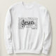 Camisola de Natal na moda cristã com verso Bíblia de Isaiah 9:6 profetizando o nascimento de JESUS. Design simples mostrando um verso Bíblia completo com JESUS sobreposto em tipografia de script em negrito. Adequado para toda a família. Pode ser transferido com êxito para qualquer item de cor clara. Versão de texto em branco também disponível.