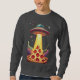 Um disco voador raptando uma fatia gigante de pizza de pepperoni com um feixe de queijo brilhante, estilo de desenho animado, cores vibrantes, fundo cósmico, vibrações retrorreflectoras.