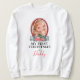 Camisola de natal da primeira família com uma foto do seu filho com dois tons vermelhos na borda, árvores de Natal com aquarela, um caminhão de coleta vermelho, e o bonito ditado "meu primeiro natal como pai".