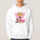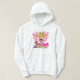 Ilustração de uma adorável menina vestida de rosa, com cabelo em pães com arcos rosa e princesa tiara. Cercado por brinquedos e com balões cor-de-rosa e dourados acima com estrelas e faixa lua. Bonito presente para esperar pais, chás de fraldas, revelação de gênero ou presente de aniversário de bebês.