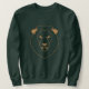 An expressive and elegant depiction of a lion's head, focusing on its regal symmetry and defining features. The artwork uses a stylized, flowing contour line for the main structure, complemented by filled-in details for the eyes, inner ears, and nose, evoking a sense of ancient heraldry. The gold-on-gray color scheme gives it a warm, premium, and sophisticated look.