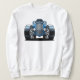 Hyper-stylized front-view toon hotrod with massive wheels, electric-blue shine, bold grille and powerful low-angle stance for a dynamic monster cartoon car look.