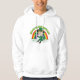 Hoodie com uma Ilustração de um belo duende sorridente vestindo um terno verde, um chapéu alto enquanto segurava uma folha de shamrock, com um arco-íris colorido ao fundo e texto dizendo "Feliz Rua. Dia de Patrick" Um design perfeito para celebrar o Dia de São Patrick, desenhado por Radka2D