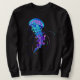 Large, blue, artistically drawn, glowing, bright jellyfish, with long tentacles on black background with purple bioluminescence. Luminous jellyfish.