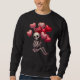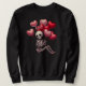 Esqueleto abraçando balões XOXO em forma de coração com o slogan romântico 'Mesmo Ossos Precisam de Amor', perfeito para o Halloween e designs Dias de os namorados.