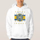 Branco-Hoodie com círculos concêntricos azuis, dourados e brancos design acima de um retângulo azul e dourado com "SAN FRANCISCO, CALIFÓRNIA CENTER DO UNIVERSO" com o selo do Excelente da Califórnia no centro e os logotipos Y-NOT-ME ao fundo. Este design é um grito para São Francisco, Califórnia, The Boom Town.