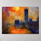 Monet Houses do Parlamento e Sunset poster. Pintura a óleo na canvas desde 1903. Monet pintou as Casas do Parlamento em diferentes épocas do dia e do ano. Esta rendição em particular é uma das suas mais detenções e violentas, com laranjas profundas, púrpuras, vermelhos e amarelos a voar sobre o Tamisa. Um presente de excelente para fãs de Claude Monet, impressionismo, paisagens de cidades e arte francesa.
