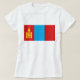 A frente desta t-shirt exibe corajosamente a bandeira mongol com o seu distinto motivo amarelo sobre uma banda vermelha com bandas azuis e vermelhas mais à direita. Isto é combinado atrás por um mapa atraente da Mongólia.