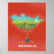 Mapa ilustrado mongol, paisagem e poster turística de férias com lâmina de avião de apoio contra um fundo vermelho vívido.