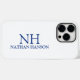 Capa de telefone moderna com um design azul e branco simples e mínimo com seu monograma em uma fonte em negrito junto com seu nome.