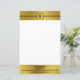 No topo, há uma tela inicial que você pode editar para mostrar o monograma direito. A letra preta é dentro um quadrado de ouro falso que tem uma borda preta. As linhas pretas estão em ambos os lados da praça. Na parte inferior, há quatro linhas de texto de exibição em preto para seu texto personalizado, como nome, título profissional, endereço, número de telefone, site ou endereço de email. Os elementos de ouro falsos não são feitos de folha.