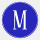 Um adesivo redondo clássico com um monograma branco sobre fundo azul real. Personalize o adesivo com suas iniciais, cores de fundo, entre outras opções.