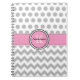 Características monogrammed modernas e na moda cinzas do caderno espiral e listras e bolinhas da viga do branco com uma beira costurada do acento fita cor-de-rosa com um quadro cor-de-rosa redondo do acento esboçado em preto e branco para seus inicial e nome. Mostre sua personalidade com este caderno espiral do divertimento e da listra na moda da viga. Aperfeiçoe para um jornal, tomando notas, trabalho, escola e casa. Faz um grande presente para todas as ocasiões. Clique "personalizam-no!" abotoe para mudar o tamanho do texto, a cor de texto, o estilo de pia batismal e o mais! Note por favor: a beira horizontal do quadro do ponto da fita do acento cor-de-rosa é rosa contínuo com uma aparência do ponto da fita.