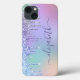 Capa de telefone feminina com cores de um monocromo arco-íris falso brilhando em um fundo roxo. Monograma com seu nome em uma bonito escrita roxa com pestanas.