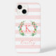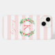 Este design de moda divertida apresenta um fundo branco, cor-de-rosa e listrado, com uma coroa floral colorida. Personalize o design com seu nome e monograma ou outro texto. Use as ferramentas de design para escolher qualquer cor de fundo, editar as fontes e cores do texto ou carregar suas próprias fotos para criar uma capa de telefone monográfica exclusiva.