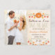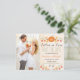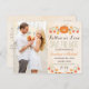 Adicione sua foto de noivado favorita a estes cartões-postais de "save the date" de casamento com tema de outono e queda de folhas com uma abóbora, videira, folhas de carvalho, floral de peônia rosa e design de bolota em um fundo de pergaminho com aparência antiga. Um coração é esculpido no centro da abóbora. As iniciais ou monograma da noiva e do noivo podem ser adicionados na parte inferior do design. Tons de laranja, coral, verde, marrom e amarelo. Arte © Chrissy H. Studios, LLC. Todos os direitos reservados.