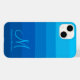 Caixa com minúscula iPhone 14 com na moda azul de gradiente de bloco de cor monograma com gabinete iPhone. Este caso do iPhone 14 de tendência será uma adição perfeita à sua coleção de eletrônicos por fazer de uma declaração que você gosta de designs modernos com um toque personalizado que inclui seu nome e inicial de monograma. Além disso, este padrão pode ser facilmente transferido para outra capas de iphone, se desejado. Seu nome e sua escolha de fontes podem ser inseridos facilmente usando a ferramenta design do Zazzle.