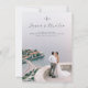 Convites de casamento em espanhol. O anverso mostra uma foto dos noivos, o monograma do casal e seus nomes em caligrafia elegante, junto aos dados principais do casamento. No verso, toda a informação prática, alojamento, confirmação e mais, com um código QR para que os seus convidados tenham tudo à mão. Um design que combina o pessoal e o funcional, sem perder esse toque especial. Versão em inglês também disponível.