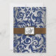 Leather Monogramas Denim Western Wedding Invitations. Corresponde às cartas RSVP e mais informações encontradas abaixo nesta página. Cada convite apresenta o impressão de folha floral em gradiente prateado sobre fundo azul denim impresso. A frente e o verso também apresentam uma banda impressa em couro marrom com um monograma quadrado que você pode personalizar para a sobrenome inicial do noivo. Estes convites para o casamento são feitos com um cartão básico de alta qualidade; entretanto, você pode mudar o estoque para linho, feltro (gravado), reciclado e várias tonalidades metálicas se quiser com o número 2 (escolha seu estilo, tamanho e tipo de papel) abaixo do botão laranja adicionar ao carrinho. Também nessa opção é apresentada uma lista dos custos adicionais de uma reserva de cartão mais antiga. Cada convite tem um envelope branco.
