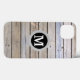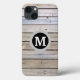 Capa de telefone com monograma de madeira com aspecto rústico. Você vai adorar este visual moderno e trendy rústico! Letra de monograma branca em círculos pretos e cinzas e um fundo de ripas de madeira.