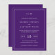 Simples convite de casamento orçamentário com um design moderno, mas elegante, com seu monograma de duas letras no topo, um layout ousado de data e seus detalhes cercados por uma borda fina. Todos os elementos de design estão em branco sobre um fundo roxo e podem ser alterados na ferramenta de edição de design. Um design chic e na moda que é excelente para um casal minimalista.