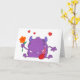 Esta design pode ser de um monstro roxo, mas é um monstro roxo muito fofo. O monstro está segurando uma flor em uma mão e há três corações de amor acima dele. O monstro também tem um sorriso engraçado no rosto. Este design de monstro roxo parece excelente nestas placas de saudação