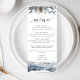 Aprecie seus convidados com este cartão de menu refinado. Design coordenando nossos convites para o casamento entre montanhas e florestas. Separe o design que apresenta no topo um arranjo floral azul rústico único e no fundo uma delicada montanha de aquarelas, florestas e florestas de raposa. Escrito à mão com tipografia Script no verso e na frente. Adicione as suas próprias informações de menu na frente e na sua mensagem on e detalhes no verso.
