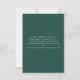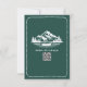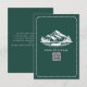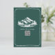 RSVP de Casamento com montanhas e ilustração evergreen e canoe com borda escalpada. O fundo é esmeralda. Personalize o texto e o código QR.